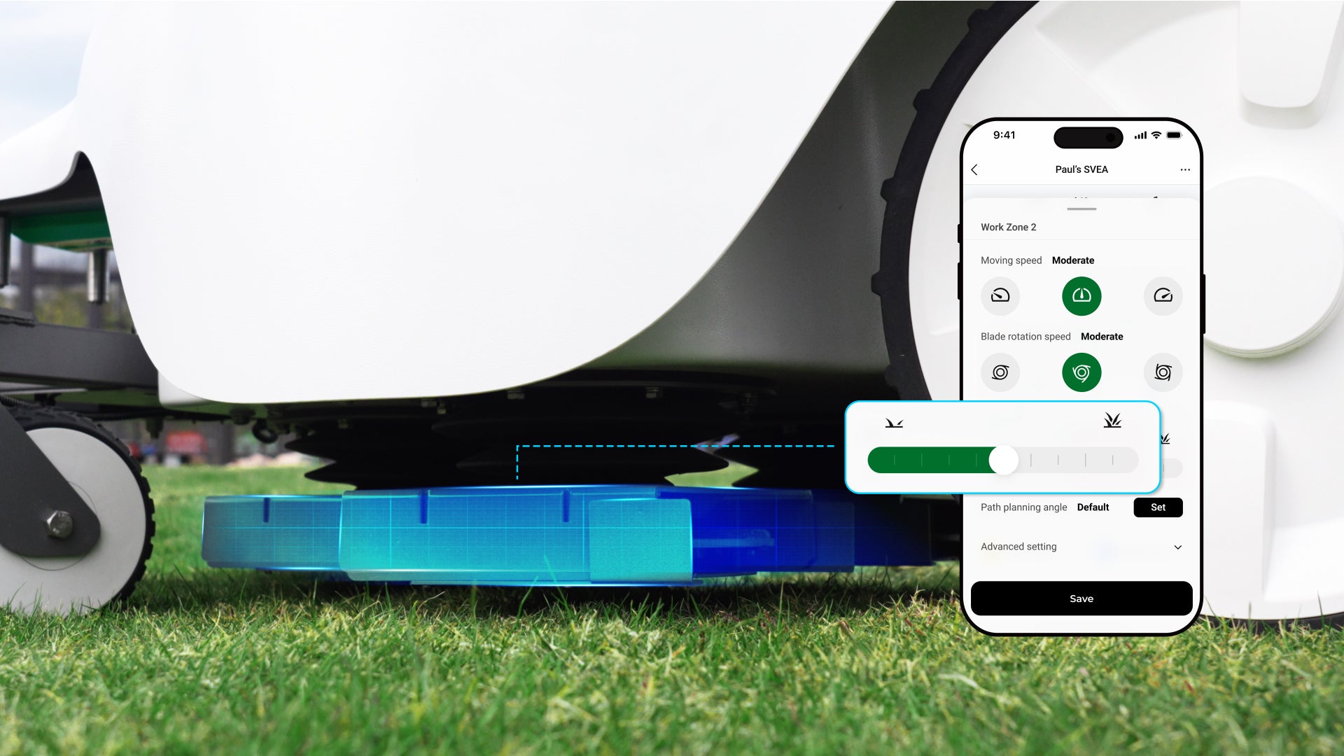 Réglez la hauteur de coupe entre 20 et 100mm sur l'application SveaMow. Adaptez vos tontes aux différents types d'herbe et aux changements de saison. En quelques clics programmez les motifs souhaités.