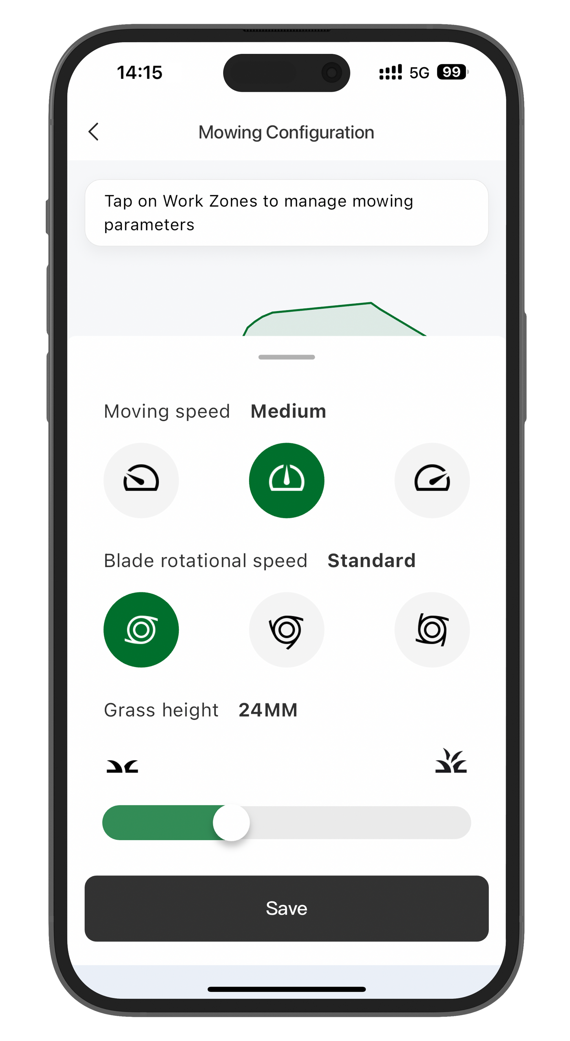 Pour une tonte optimale nous recommandons une vitesse d'avancement du robot moyenne ou rapide et une vitesse de rotation du plateau de coupe lente ou moyenne. La vitesse de rotation maximale est à utiliser uniquement pour les tontes manuelles avec guidage par smartphone.